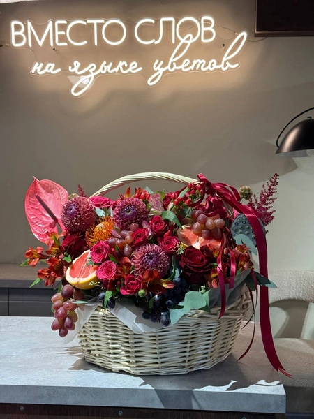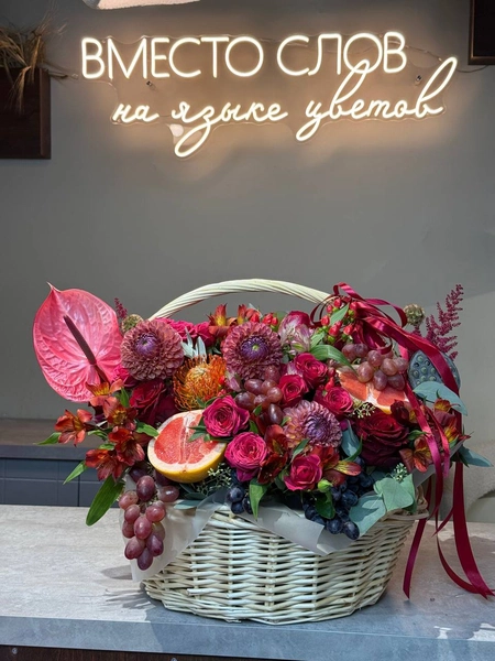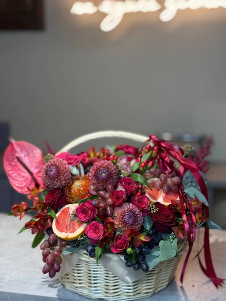 Состав букета: георгин (3 шт.), антуриум (1 шт.), одноголовые розы (5 шт.), альстромерии (7 шт.), кустовые розы (5 шт.), леукоспермум (1 шт.), гиперикум (2 шт.), астильба (2 шт.), коробочка лотоса (1 шт.), скабиоза (2 шт.), грейпфрут (1 шт.), виноград и корзина.