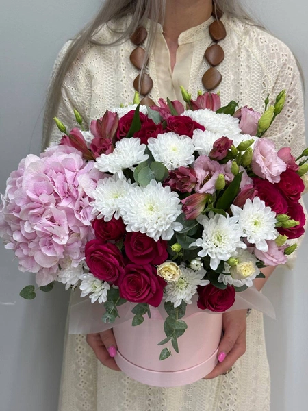 Состав букета: гортензия (1 шт.), кустовая роза (3 шт.), кустовая хризантема (3 шт.), альстромерия (3 шт.), эустома (3 шт.), эвкалипт (2 шт.) и коробка.