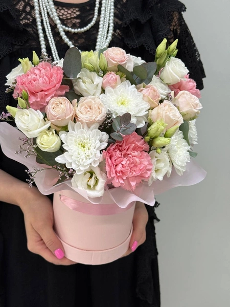 Состав букета: кустовая хризантема (2 шт.), диантус (3 шт.), эустома (2 шт.), кустовая роза (2 шт.), лимониум (1 шт.), эвкалипт (2 шт.) и коробка.