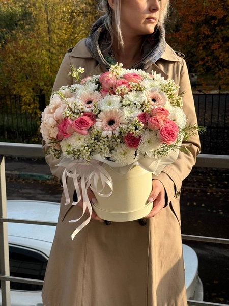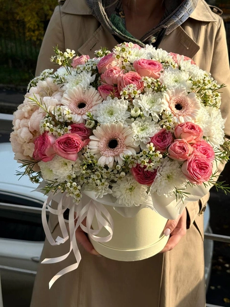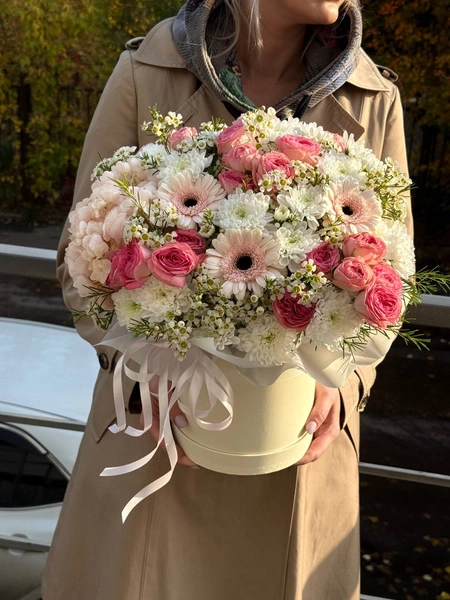 Состав букета: гортензия (1 шт.), кустовая роза (5 шт.), кустовая хризантема (5 шт.), гербера (3 шт.), хамелациум (2 шт.) и коробка.