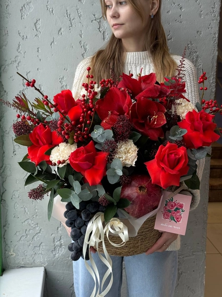 Состав букета: илекс (3 шт.), амариллис (1 шт.), аспарагус (2 шт.), скиммия (2 шт.), астильба (5 шт.), диантус (3 шт.), рускус (20 шт.), эвкалипт (2 шт.), сафари (2 шт.), одноголовая роза (7 шт.), гранат, виноград и корзина.