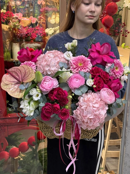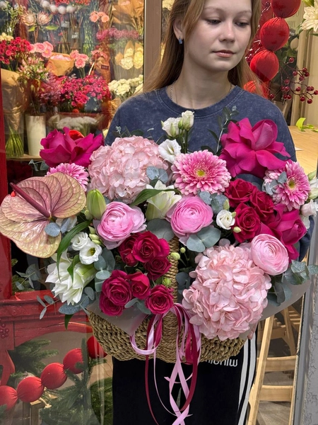 Состав букета: гортензия (2 шт.), антуриум (1 шт.), одноголовая роза (3 шт.), ранункулюс (3 шт.), гербера (3 шт.), кустовая роза (5 шт.), лилия (1 шт.), эустома (4 шт.), эвкалипт (4 шт.) и корзина.