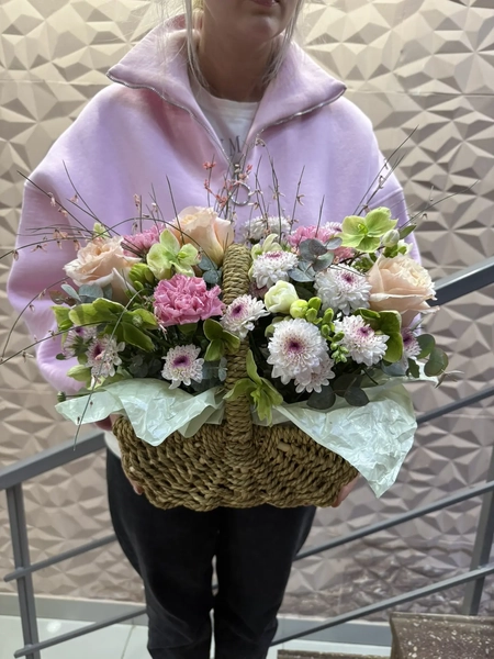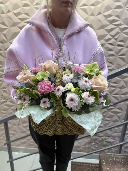 Состав букета: диантус (3 шт.), роза одноголовая (3 шт.), сантини (3 шт.), гениста (2 шт.), эвкалипт (1 шт.), корзина (1 шт.)