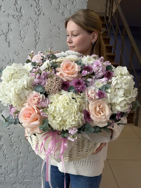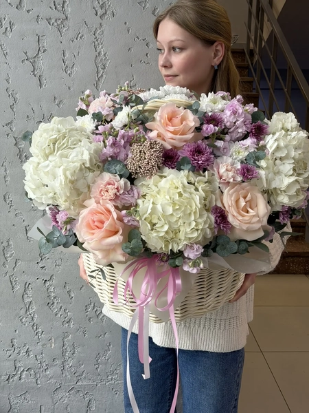 Состав букета: гортензия (3 шт.), одноголовая роза (5 шт.), эустома (7 шт.), кустовая хризантема (8 шт.), диантус (3 шт.), озотамнус (3 шт.), эвкалипт (4 шт.), корзина (1 шт.)