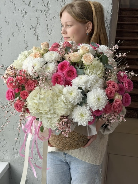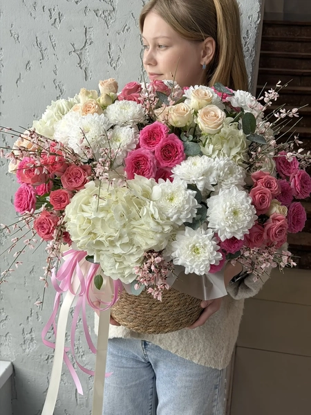 Состав букета: гортензия (3 шт.), хризантема кустовая (4 шт.), гениста (3 шт.), кустовая роза (11 шт.), эвкалипт (1 шт.), корзина (1 шт.)