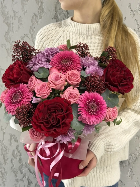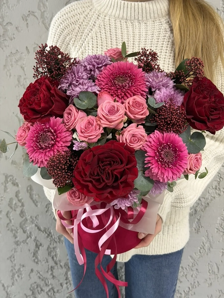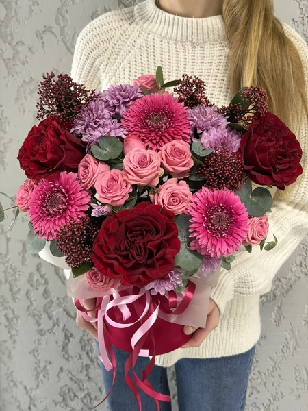 Состав букета: одноголовая роза (3 шт.), кустовая роза (3 шт.), кустовая хризантема (3 шт.), скимия (3 шт.), гербера (3 шт.), эвкалипт (2 шт.), коробка (1 шт.)