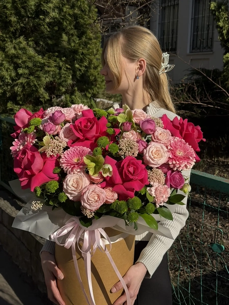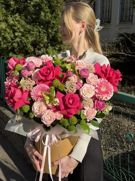 Состав букета: одноголовая роза (5 шт.), гербера (3 шт.), диантус (3 шт.), сантини (5 шт.), хелеборус (3 шт.), кустовая роза (7 шт.), озотамнус (2 шт.), рускус (7 шт.), коробка (1 шт.)
