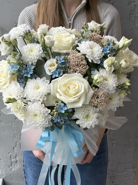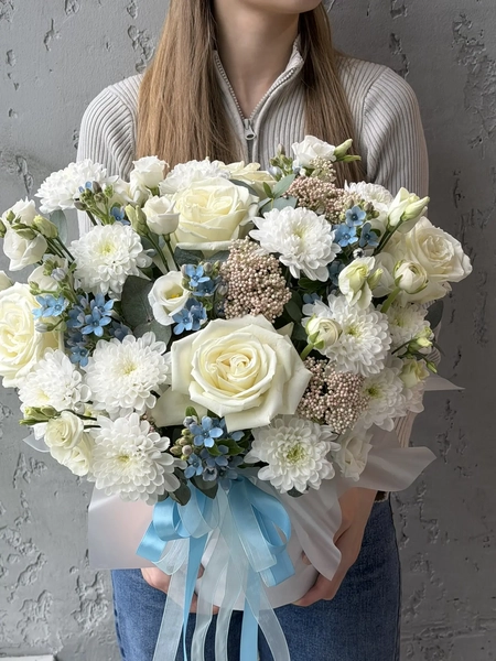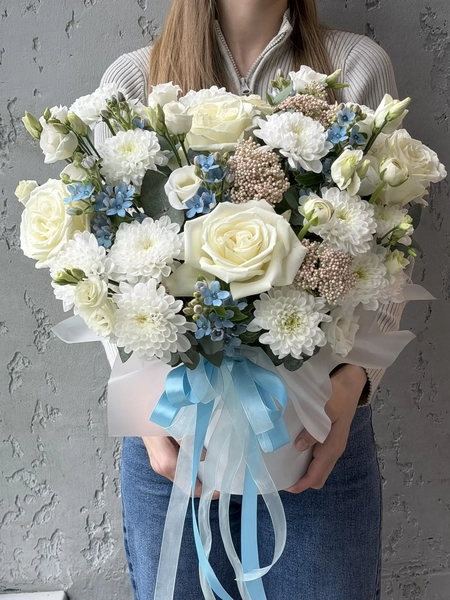 Состав букета: одноголовая роза (5 шт.), кустовая хризантема (3 шт.), оксипеталум (6 шт.), эустома (3 шт.), эвкалипт (1 шт.), коробка (1 шт.)