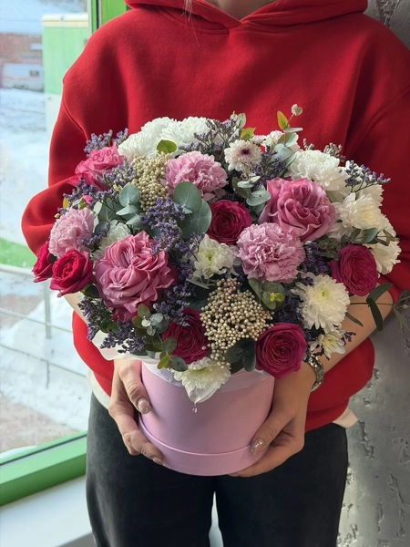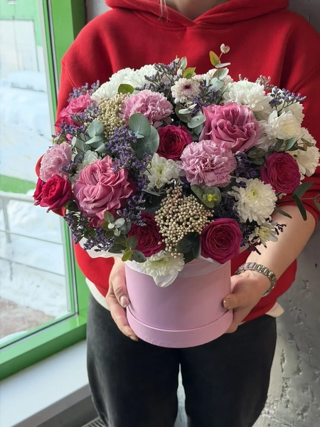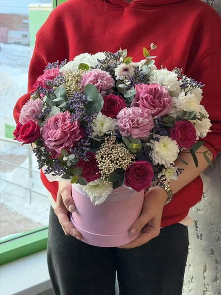 Состав букета: кустовая хризантема (3 шт.), диантус (3 шт.), одноголовая роза (3 шт.), озотамнус (2 шт.), лимониум (2 шт.), эвкалипт (4 шт.), сантини (1 шт.), кустовая роза (3 шт.), коробка (1 шт.)