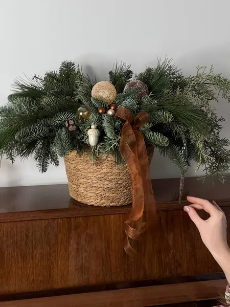 Новогодняя композиция ручной работы, выполненная из веток датской ели Нобилис. При правильном уходе ель порадует 3-4 недели.